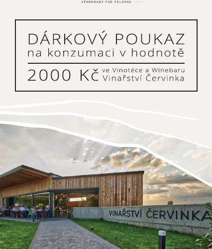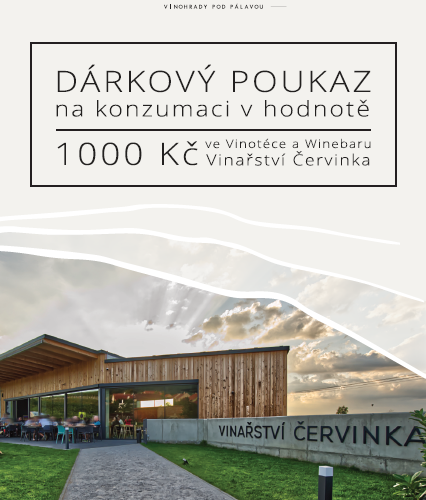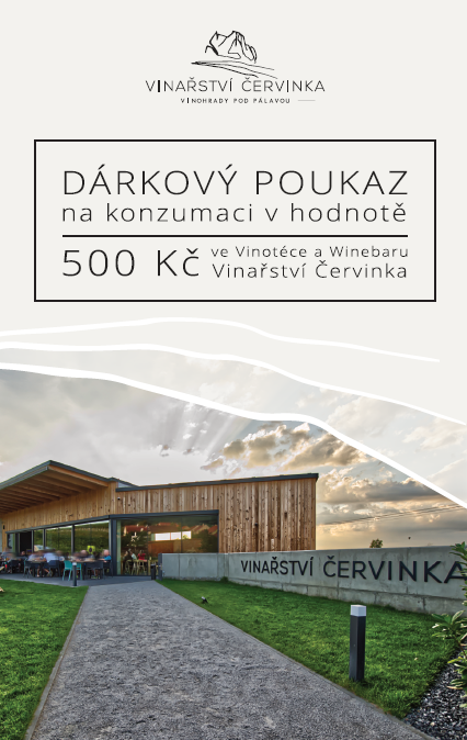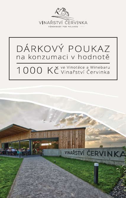 Přinášíme vám ideální dárek pro vaše blízké v podobě dárkového poukazu na konzumaci vína a dalších lahůdek přímo u nás. Užijte si jedinečný zážitek ve společnosti skvělých vín a lahodných pochoutek v prostředí Vinotéky Červinka. Darujte svým blízkým nezapomenutelný zážitek plný chuťových dobrodružství a vynikajícího pohoštění. Dárkové poukazy máme k dispozici jak tištěné tak i v elektronické podobě, podle vašich preferencí. Mohou být zakoupeny v hodnotě 1000,- 2000,- případně dle vašeho přání vytvoříme poukaz na libovolnou hodnotu, která odpovídá vašim možnostem a potřebám obdarovaného.